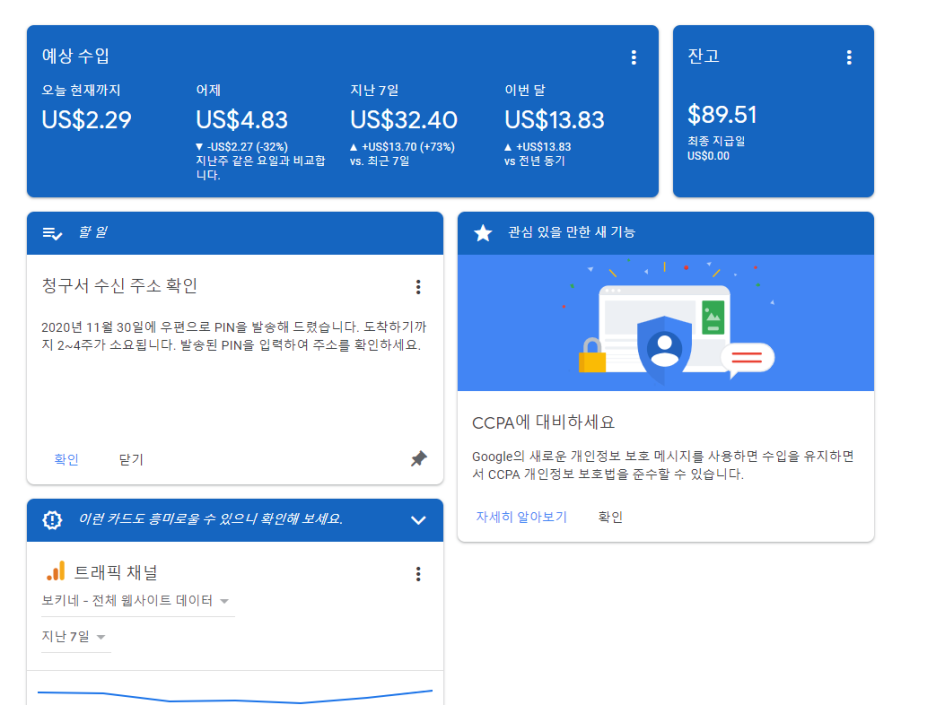 첫 한달은 최적화기간이라 10달러 이하로 광고수익이 모였구요